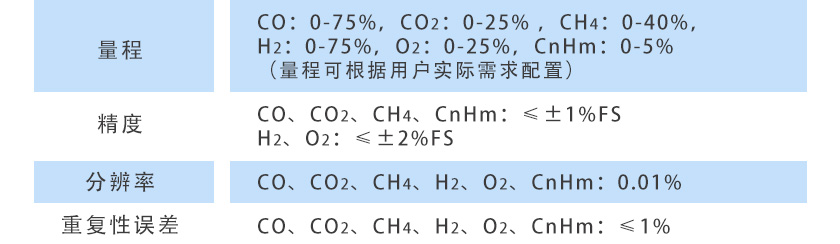 CO:0-75%,CO2:0-25% ,CH4:0-40%,H2:0-75%,O2:0-25%,CnHm:0-5% (量程可根據(jù)用戶實(shí)際需求配置) |