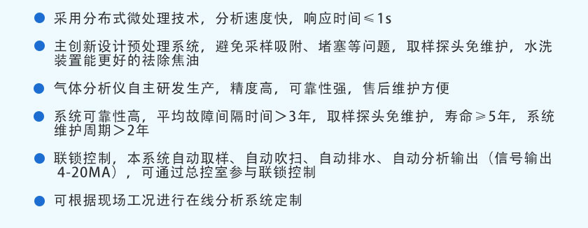 • 在線煤氣分析系統 TY-8300 TY-8300型煤氣在線分析系統是天禹智控自主研發新型在線監測系統,該產品基于非分光紅外(NDIR)氣體分析技術、長壽命電化學傳感技術以及基于MEMS的熱導技術,可同時在線測量煤氣的熱值,以及CO、CO2、CH4、H2、O2、CnHm等氣體的體積濃度。預處理系統采用冷干法設計,關鍵部件采用原裝進口,可根據現場不同的工況條件,為客戶定制解決方案,保證分析系統的可靠運行。
